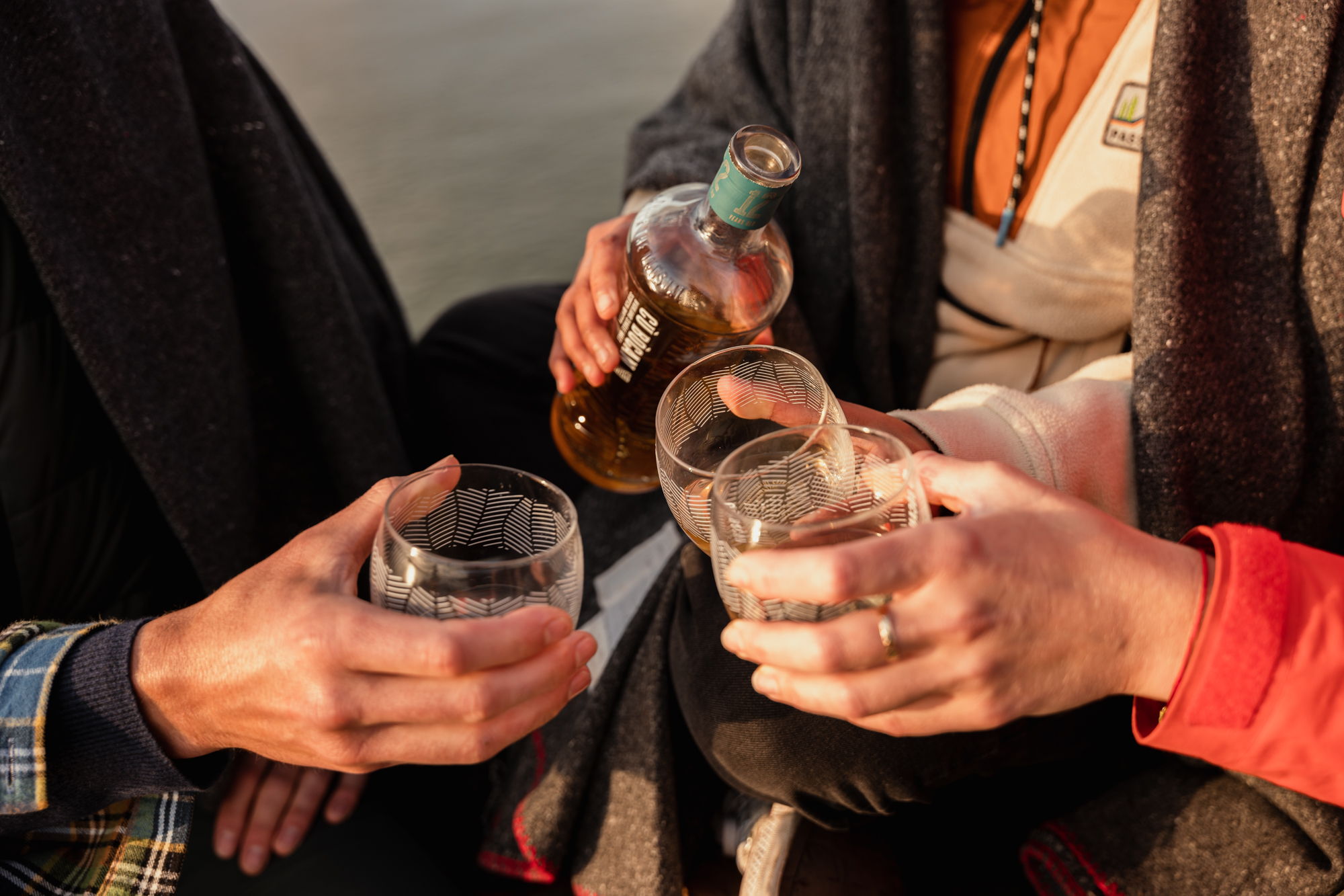 Cu Bocan 12 Year Old Lifestyle bottle and glasses on boat sunset JPG